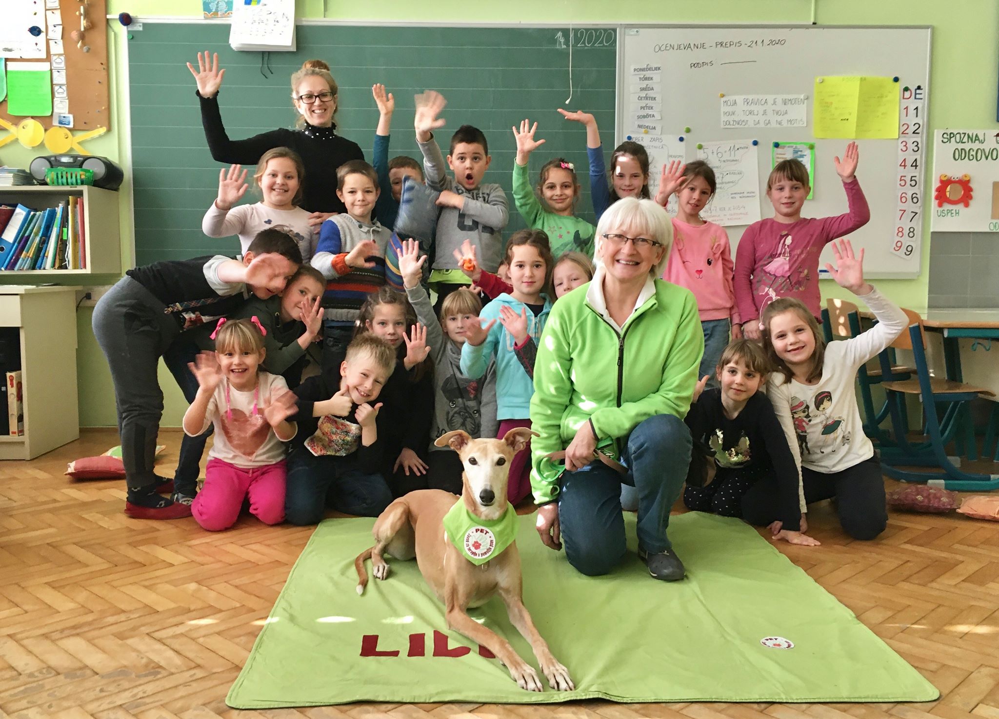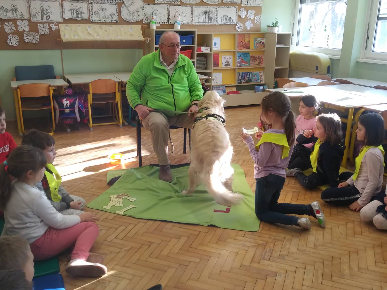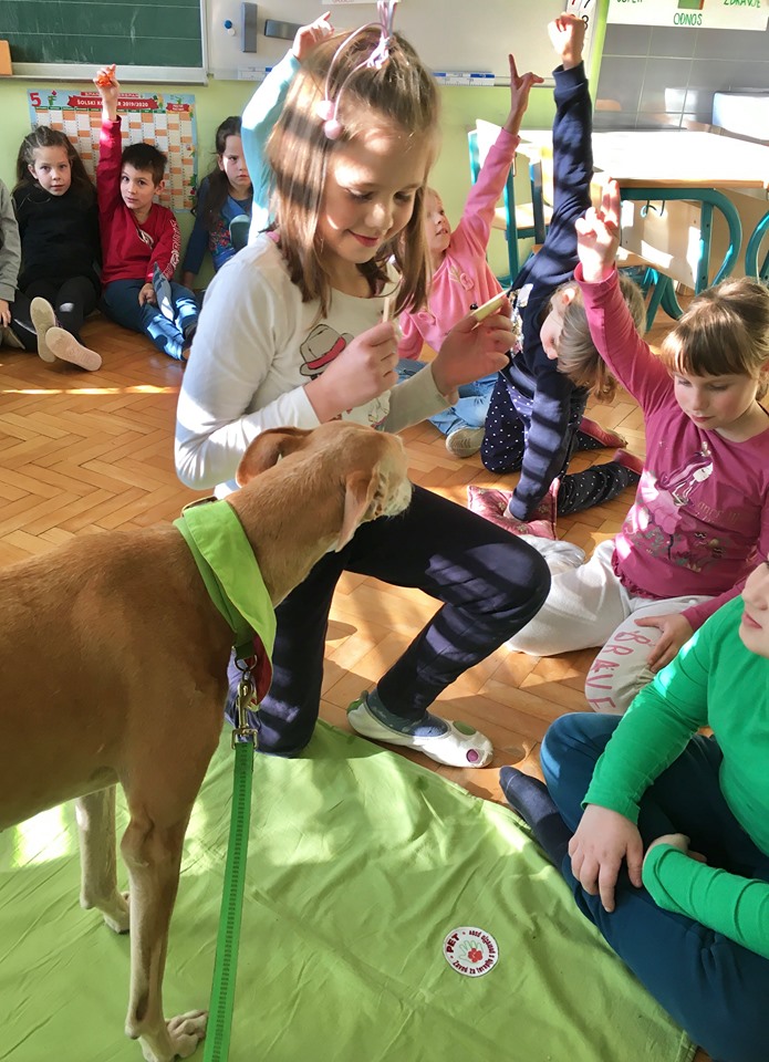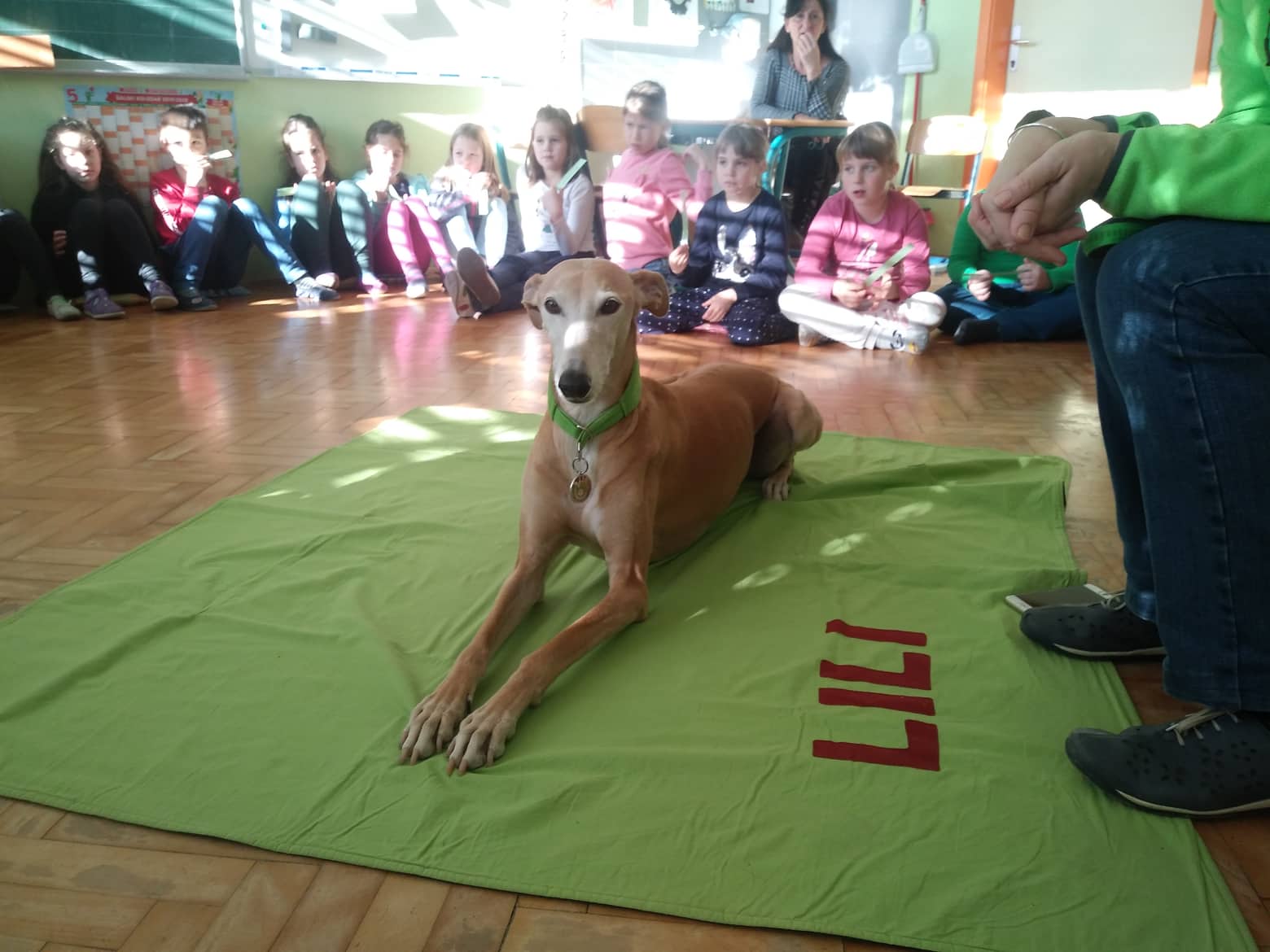 Ob prihodu terapevtskih parov v učilnici 2. a in 2. b, smo z učenci ponovili pravila obnašanja ob psu, nato pa sta g. Zoran in ga. Branka svoja psička tudi predstavila. Učencem smo povedali, da sta Lili in Lan prišla poslušat, kako dobro že učenci berejo. Prav vsak učenec se je potrudil in prebral zgodbo o Lili oziroma Lanu. Kužka sta zbrano poslušala in vsakič, ko je bilo omenjeno njuno ime, sta prikupno zastrigla z ušesi. Po prebrani zgodbi so učenci izmenično pristopili do Lili oziroma Lana ter jima na oprsnico in povodec s ščipalko pripeli papirnato kost z vprašanjem o zgodbi. Seveda, Lili in Lan sta želela preveriti, kako dobro so učenci poslušali zgodbo in koliko so si zapomnili. Učenke in učenci so posamezno pristopili do psa, ga pozdravil in prebrali vprašanje. S skupnimi močmi smo na vprašanja odgovorili in obnovili Lilijino oziroma Lanovo zgodbo.