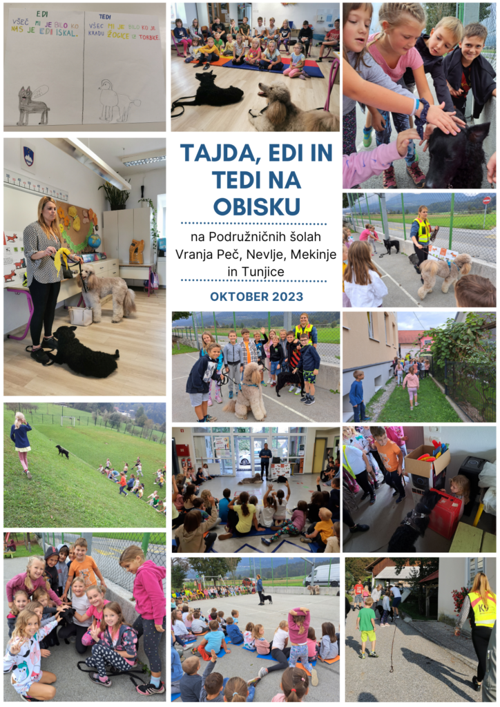 Tajda je v družbi hrvaškega ovčarja Edija in kraljevega pudlja Tedija letos prvič obiskala naše podružnične šole v Tunjicah, Nevljah in na Vranji Peči. Na PŠ Mekinje pa smo se že drugo leto zapored imeli možnost družiti z veterinarko Tajdo. Nazorno nam je razložila vse, kar nas je zanimalo in je pomembno vedeti o psih. Naučili smo se, kako naj ravnamo, če  srečamo  psa, ki se naokoli sprehaja brez lastnika. Pomembno je, da neznanega psa nikoli ne gledamo v oči, ne silimo vanj, stojimo na miru in smo tiho. S takšnim obnašanjem lahko preprečimo marsikatero negativno izkušnjo. Za učence, ki že imajo slabo izkušnjo z bližnjim srečanjem s spuščenim psom, so bile te informacije izrednega pomena.