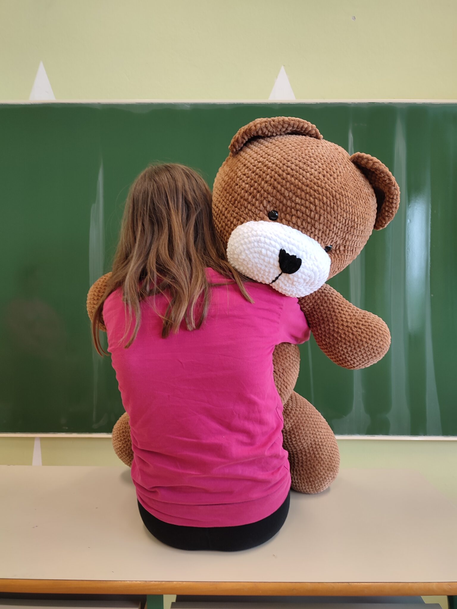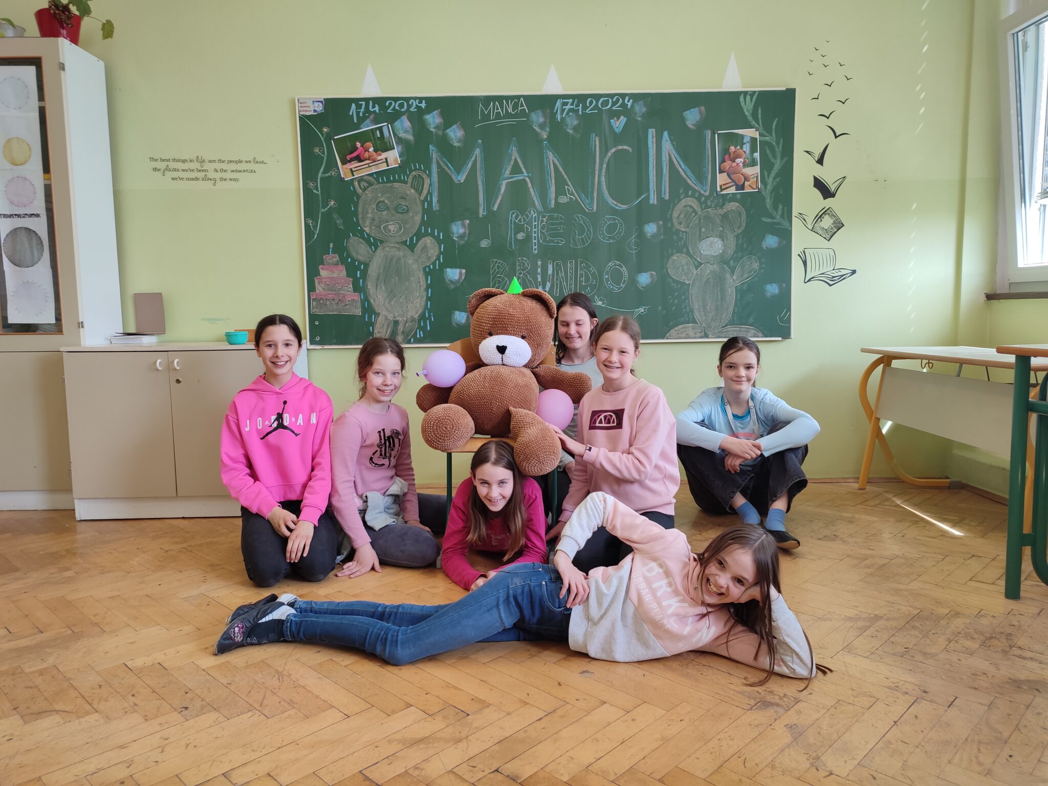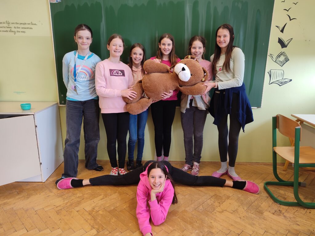 Najnovejši dosežek naše šole je iz žametne niti ustvarjen velikanski medved. Manca Č., učenka 6. a razreda, je s svojim talentom za kvačkanje osvojila srca vseh. S svojimi spretnimi rokami in 5 mm kvačko je ustvarila kar 90 cm velikega medveda.