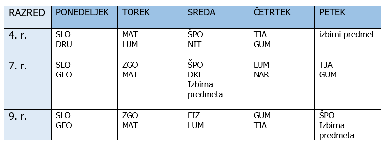 Nekateri učitelji so objavili program dela za en teden in morda vam je težko razporediti delo po dnevih. Možnosti imate več. Ali se držite klasičnega urnika, to pomeni, vsak dan več predmetov krajši čas ali pa si razporedite predmete čez teden. Ko boste delati razpored predmetov imejte v mislih, da je dobro kombinirati predmete, ki so si različni in terjajo drugačen način učenja. Npr. matematika – naravoslovje, angleščina – biologija.