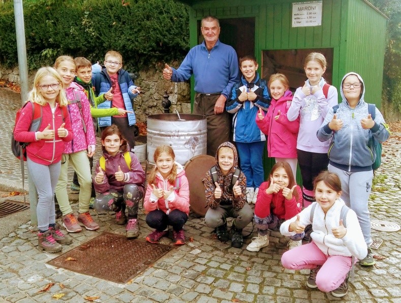 Učenci interesne dejavnosti POHAJKUJEMO S FRANČKOM smo se danes podali na prvo pohajkovanje. Malico za na pot nam je spekel kar znani kamniški kostanjar.