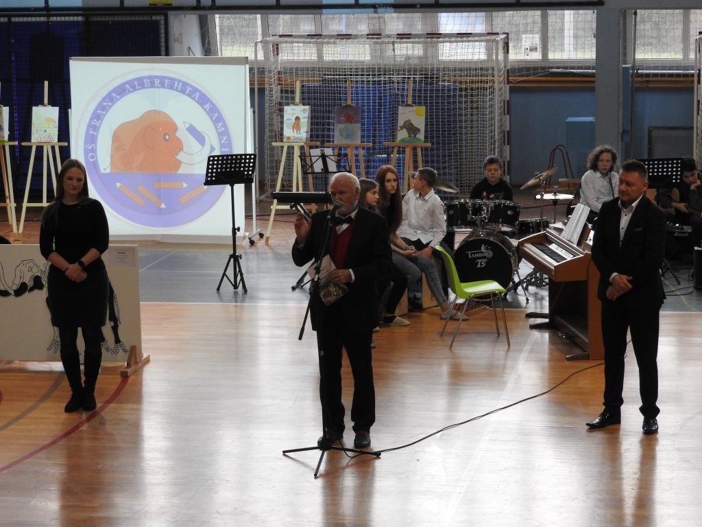 Priča smo bili odkritju kipa mamuta, ki ga je izdelal kamniški kipar Miha Kač. Župan Matej Slapar je skupaj s predstavniki lokalne skupnosti in ženo pokojnega kiparja, gospo Mir Kač šoli poklonil omenjeni kip. Mamut bo dobil svoje »častno mesto« v avli matične šole.