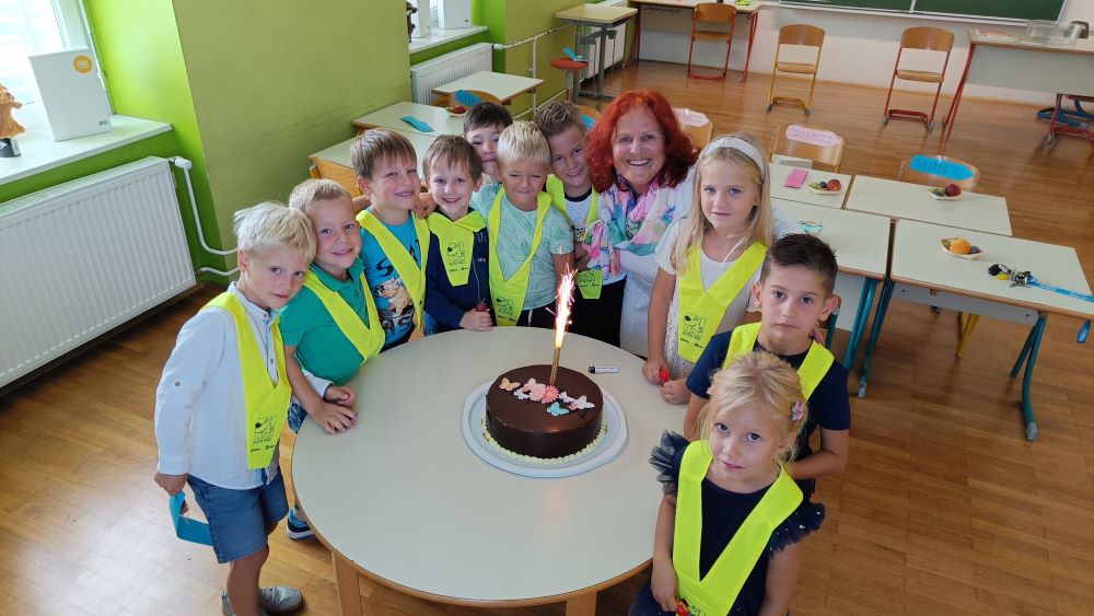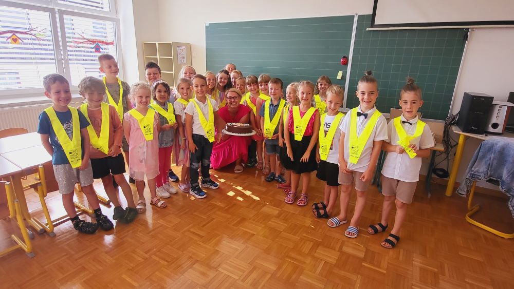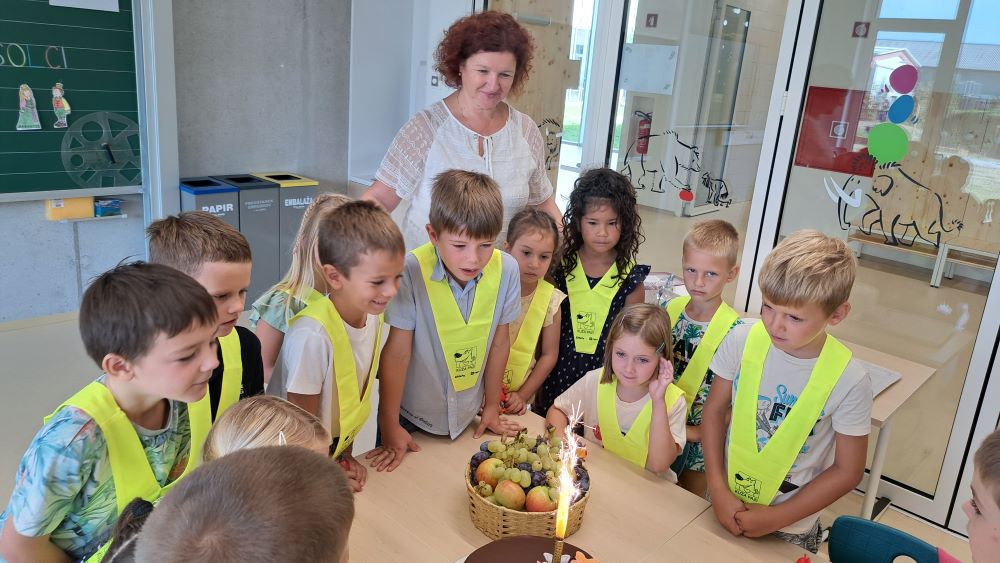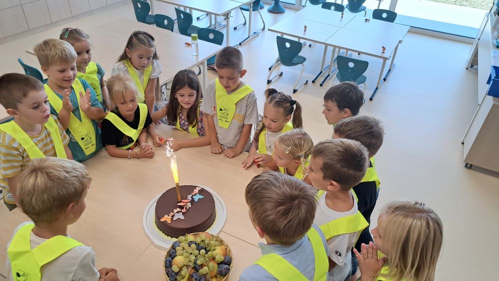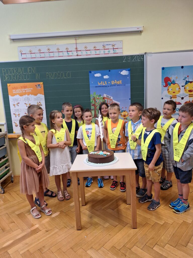 Po uvodnem spoznavanju in kratkem klepetu je sledil prav poseben trenutek, ko so prvošolčki prejeli svoje rumene rutice, simbol njihovega začetka na poti izobraževanja. Sladko presenečenje – tortica pa je poskrbela za nasmehe na obrazih.