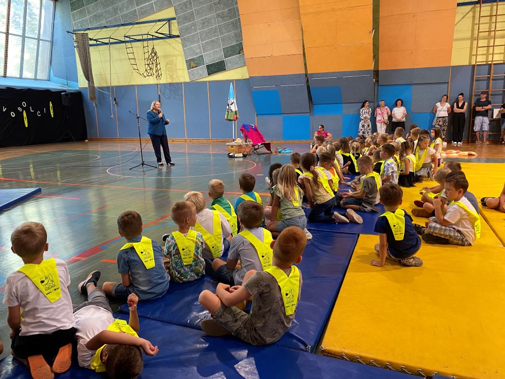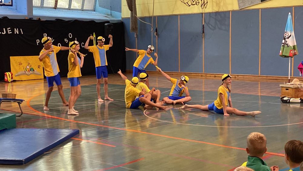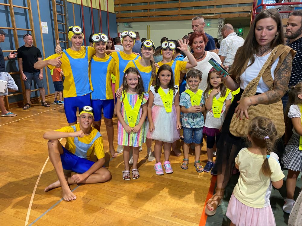Dan se je zaključil z veselo prireditvijo v športni dvorani matične šole. Ga. ravnateljica je najmlajšim učencem in njihovim staršem izrekla dobrodošlico. Vsi pa smo spoznali krasno gospo Štefanijo (našo učiteljico Mojco Praprotnik), polno modrosti in humorja ter razigrane minjone, ki so pod mentorstvom učiteljice Tamare Bračič, poskakovali na mali prožni ponjavi visoko v zrak. Prvošolcem in njihovim staršem so pripravili prijeten sprejem v šolsko skupnost. Bili smo polni navdušenja, ponosa in veselja, saj smo vsi skupaj začutili, da se je začelo nekaj zares posebnega.