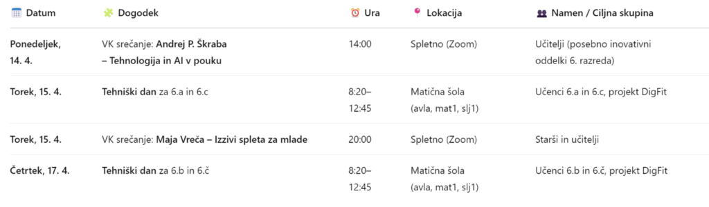 V času od 14. do 17. aprila 2025 je potekal prvi teden aktivnosti, v katerega smo vključili vse šolske deležnike.