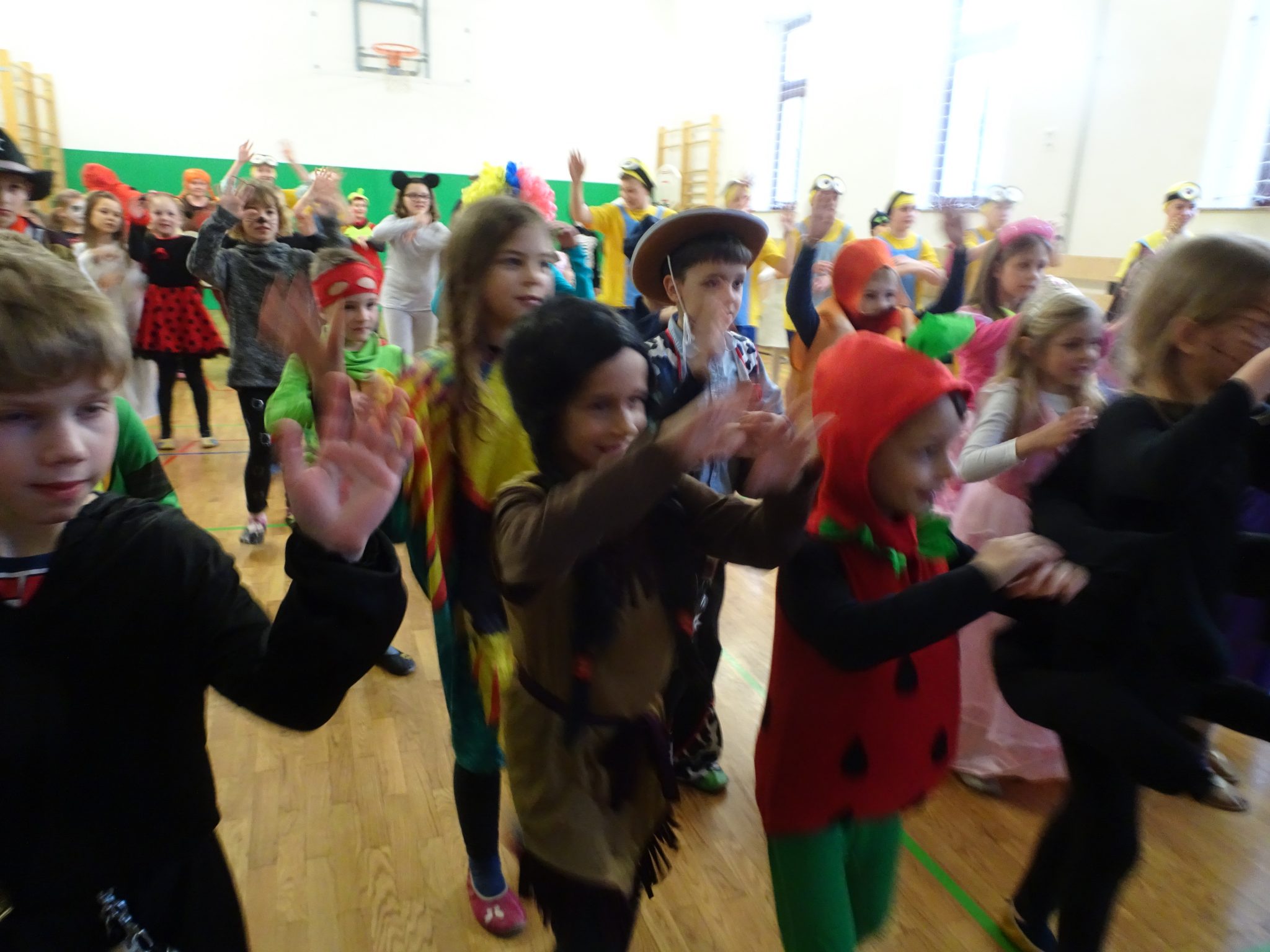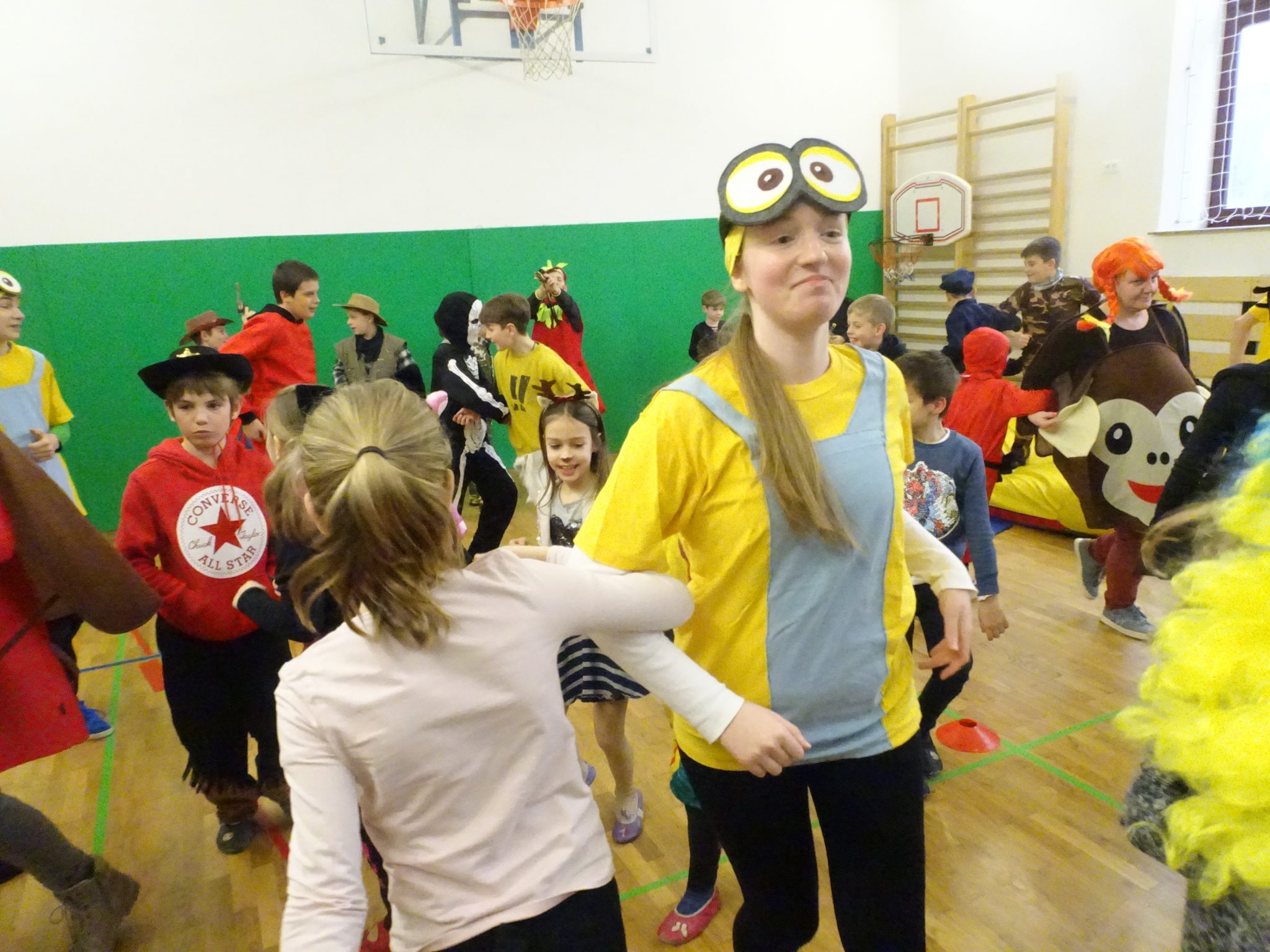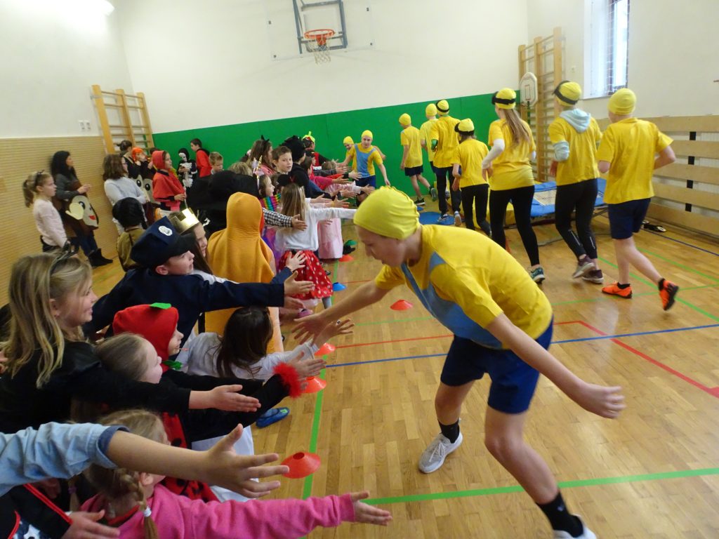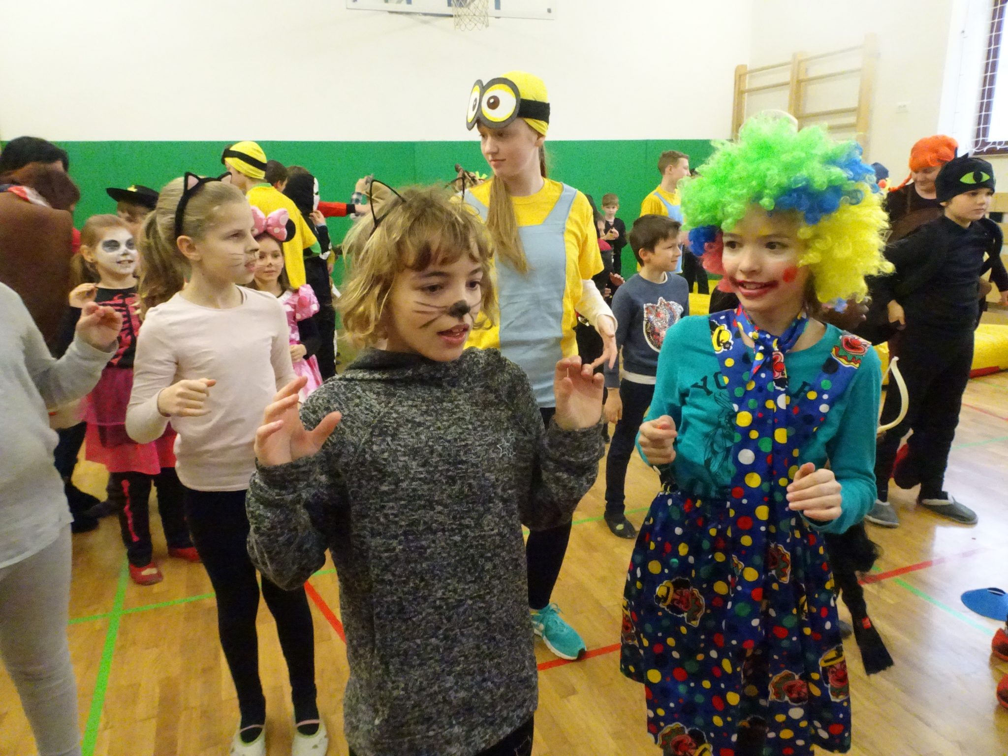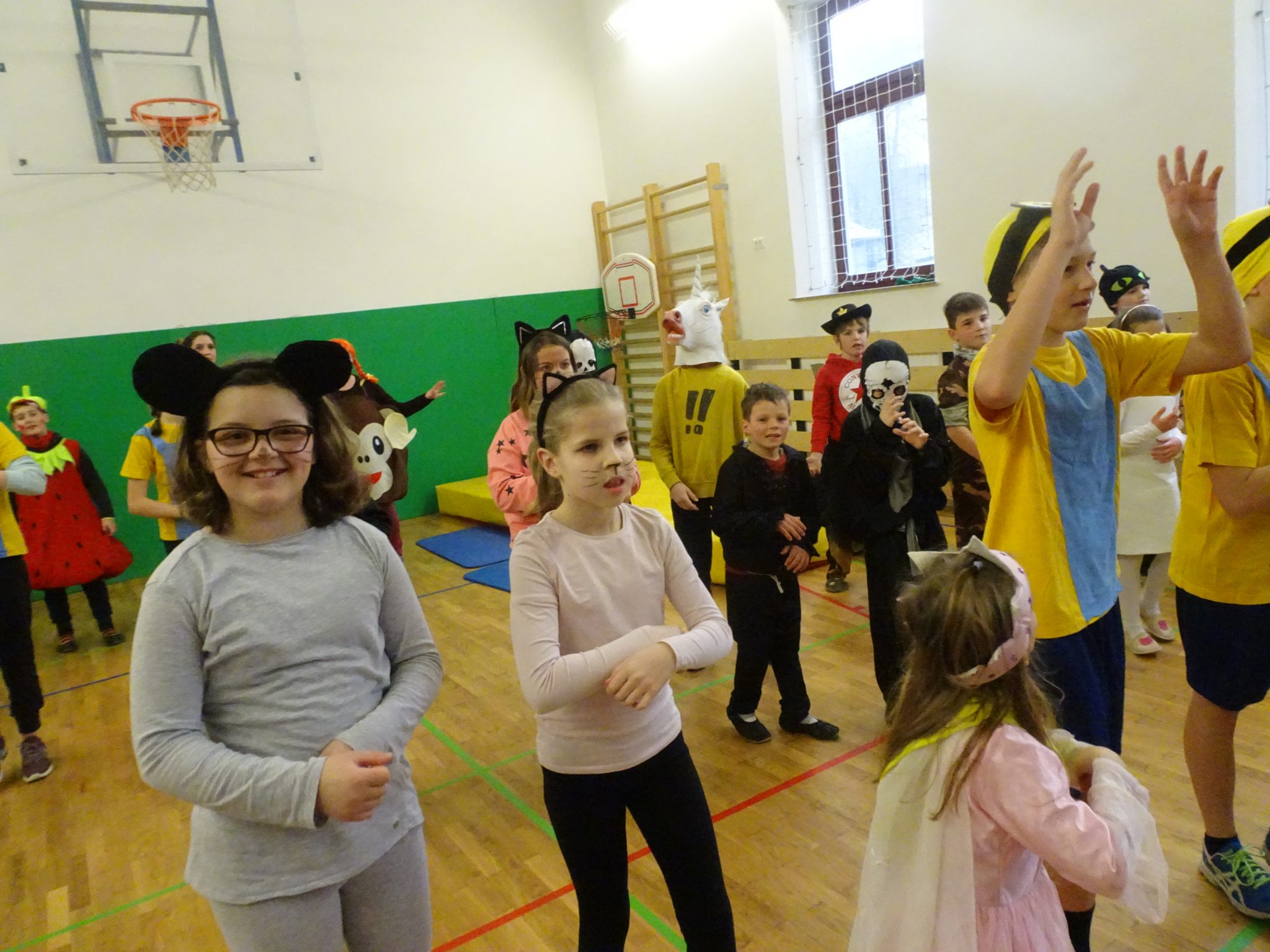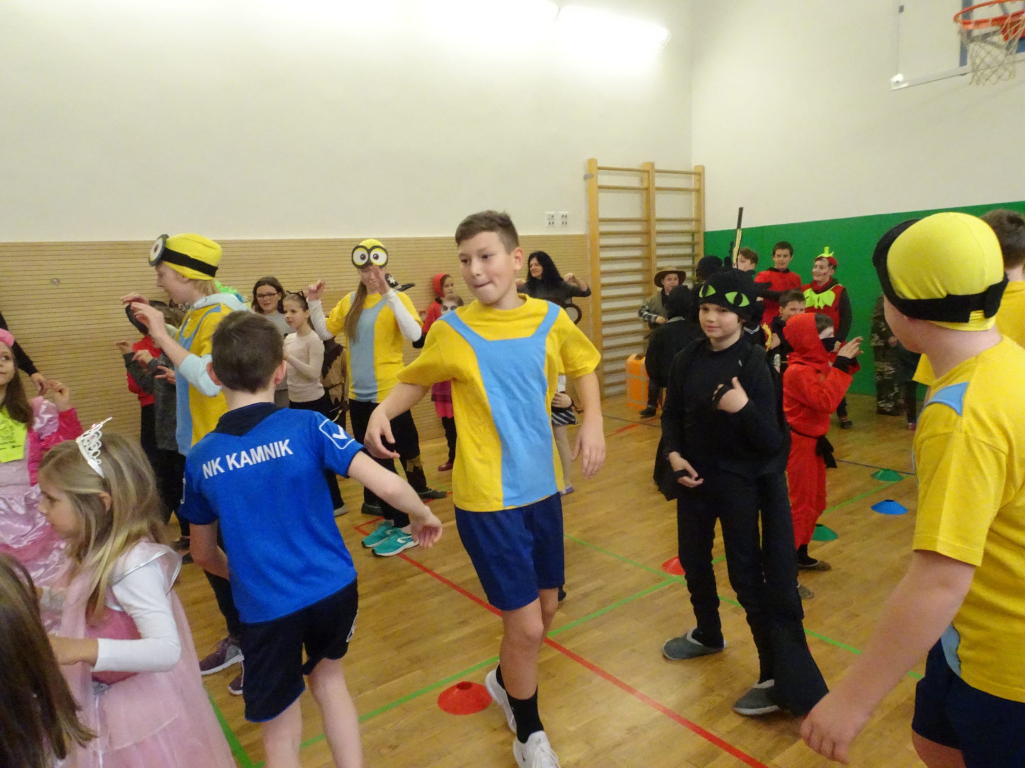 Tako kot vsako leto smo kljub deževnim kapljam odšli na pustno rajanje v telovadnico. Tam nas je pričakalo nekaj učencev predmetne stopnje, ki so pod vodstvom učiteljice Tamare pripravili zabavni program. Pustne šeme so se preizkusile v lovljenju, štafetnih igrah in plesu.