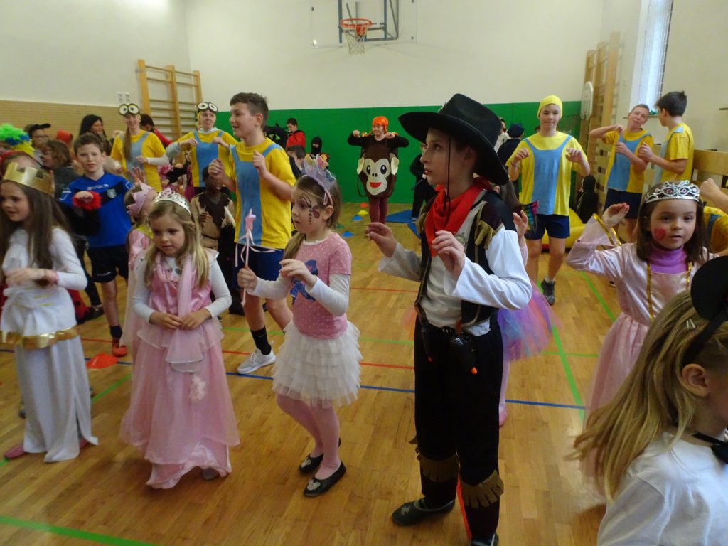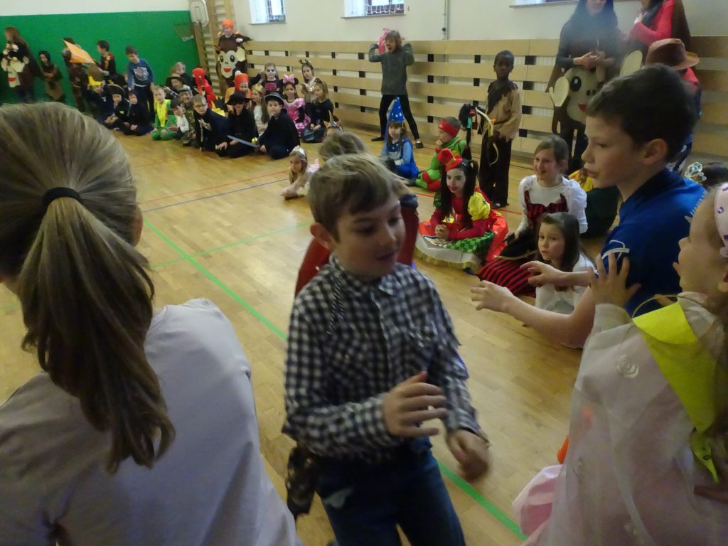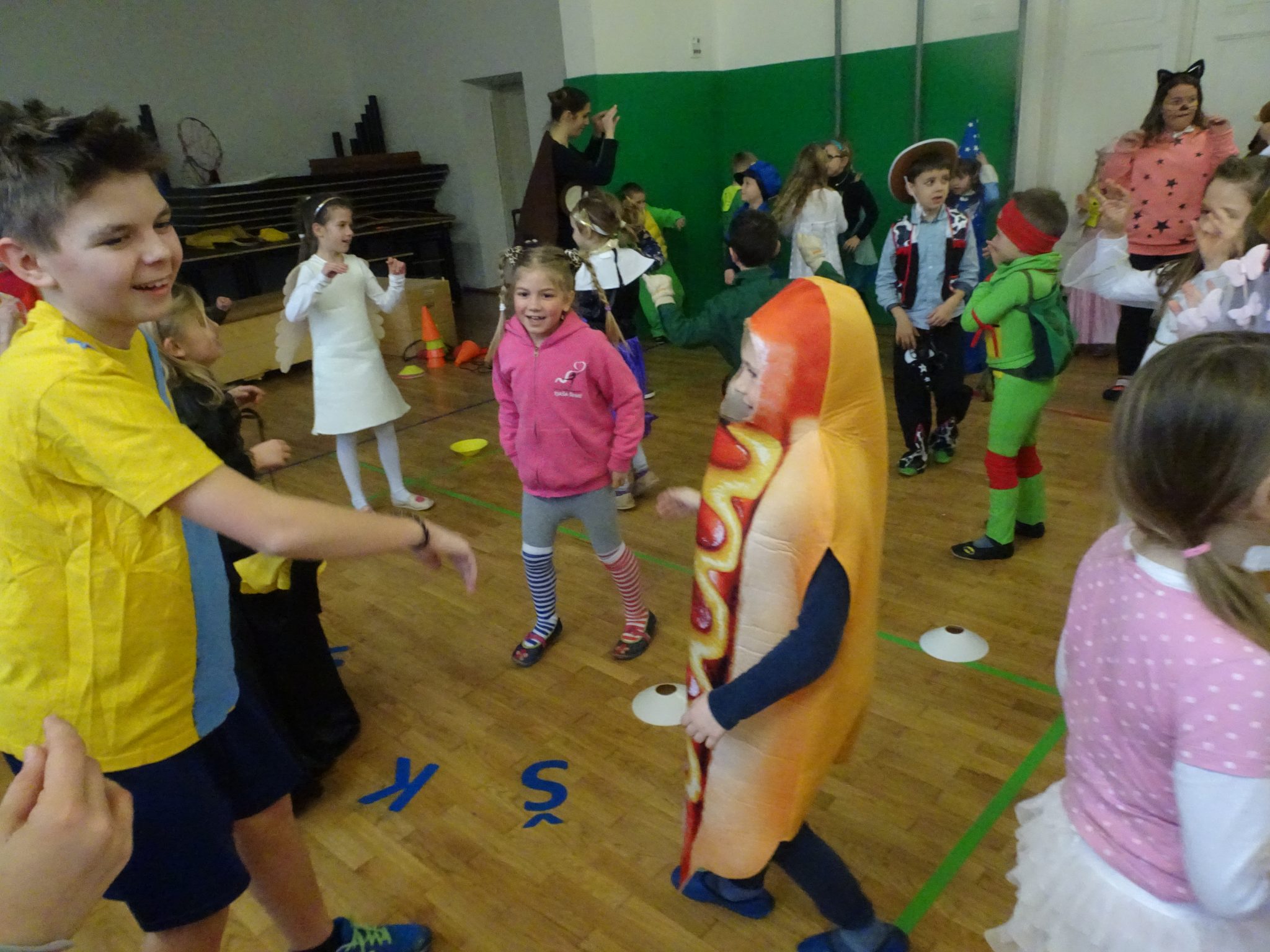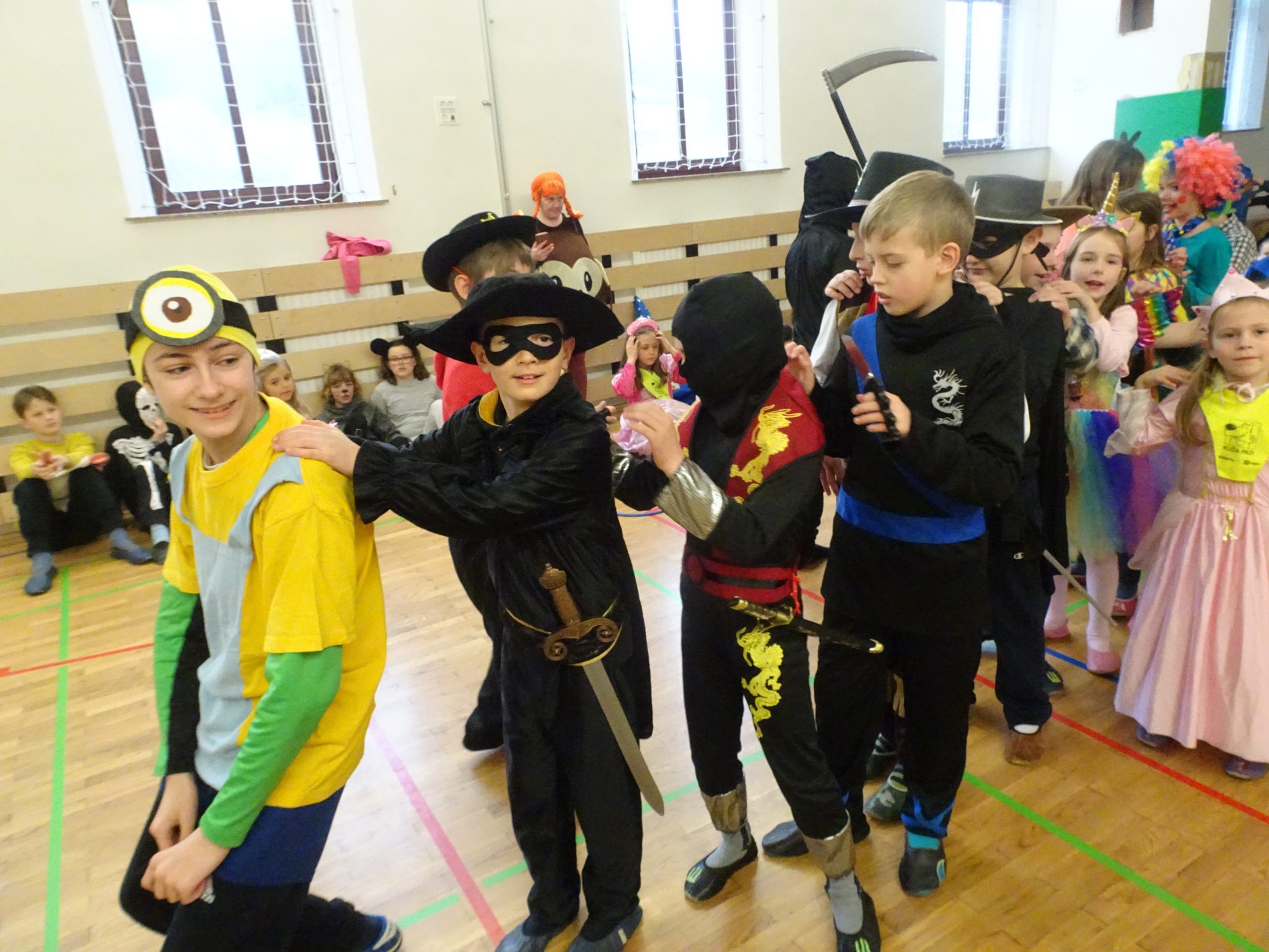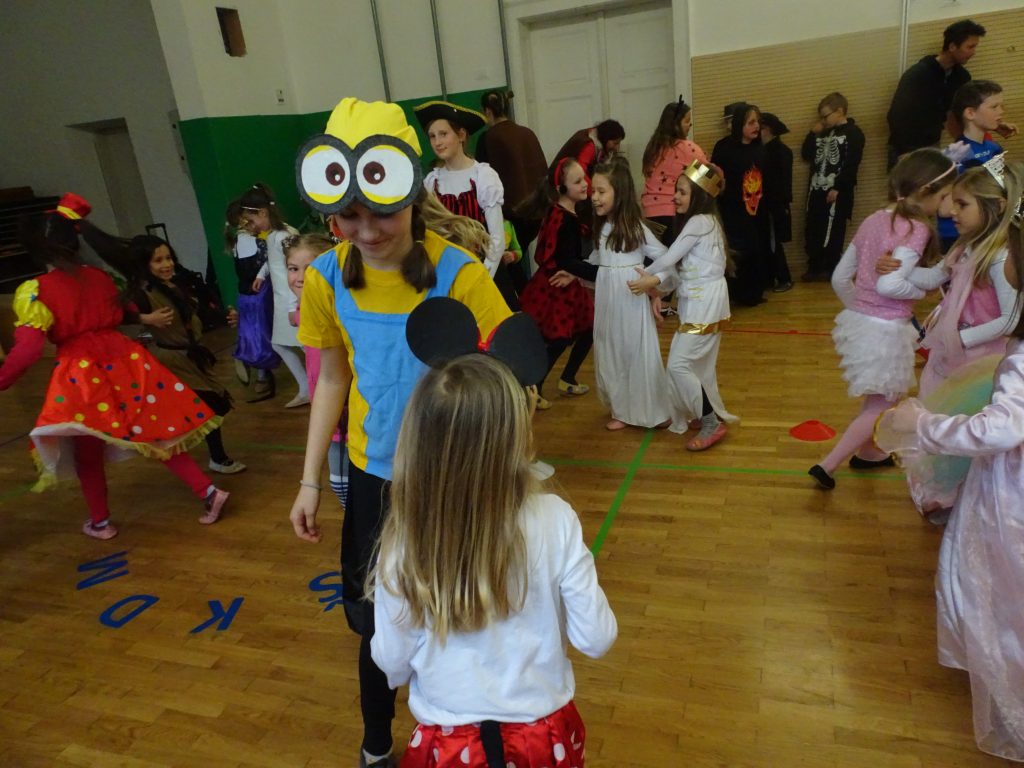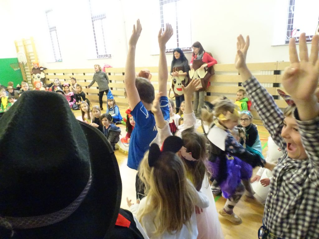 Tako kot vsako leto smo kljub deževnim kapljam odšli na pustno rajanje v telovadnico. Tam nas je pričakalo nekaj učencev predmetne stopnje, ki so pod vodstvom učiteljice Tamare pripravili zabavni program. Pustne šeme so se preizkusile v lovljenju, štafetnih igrah in plesu.