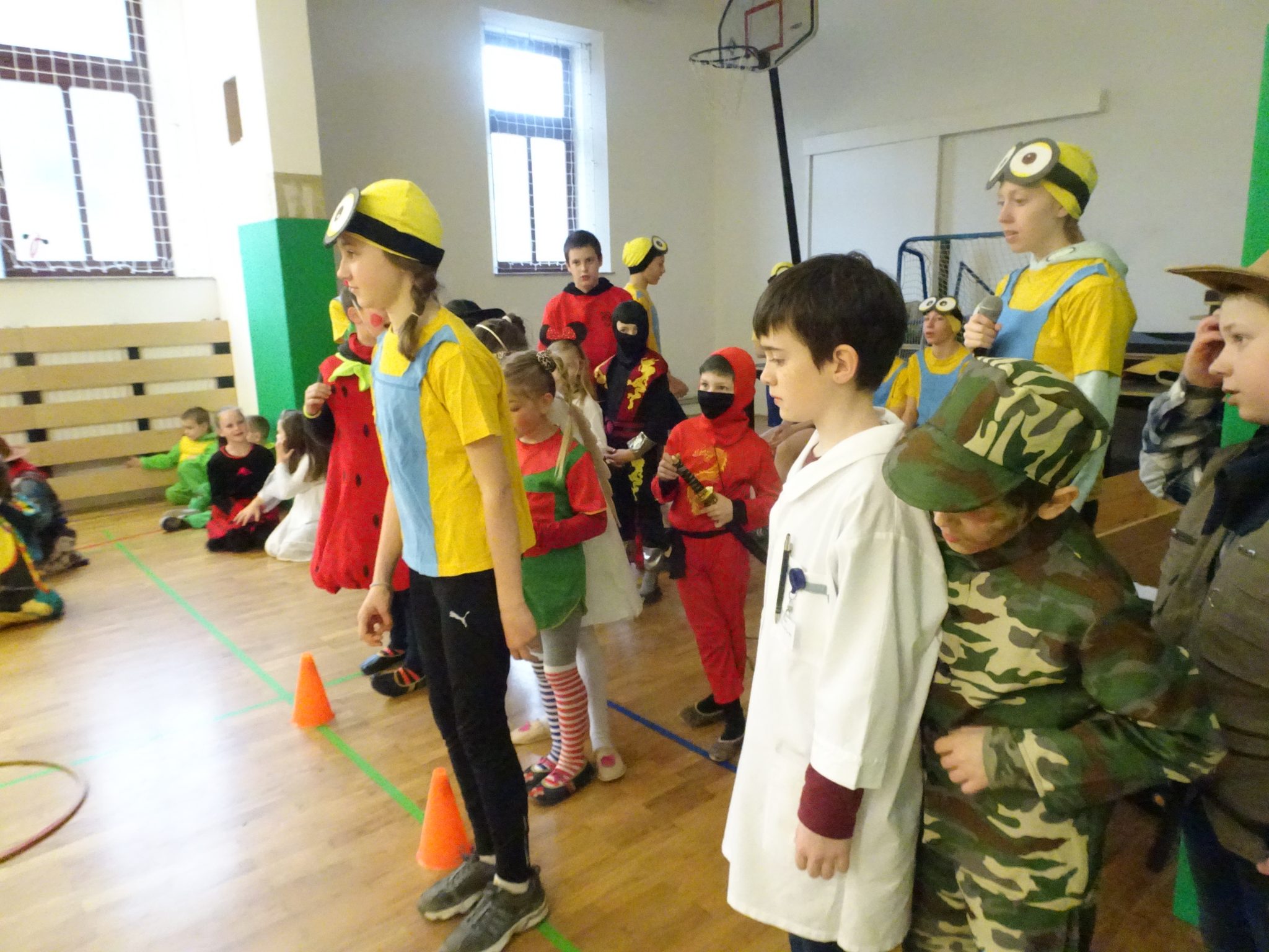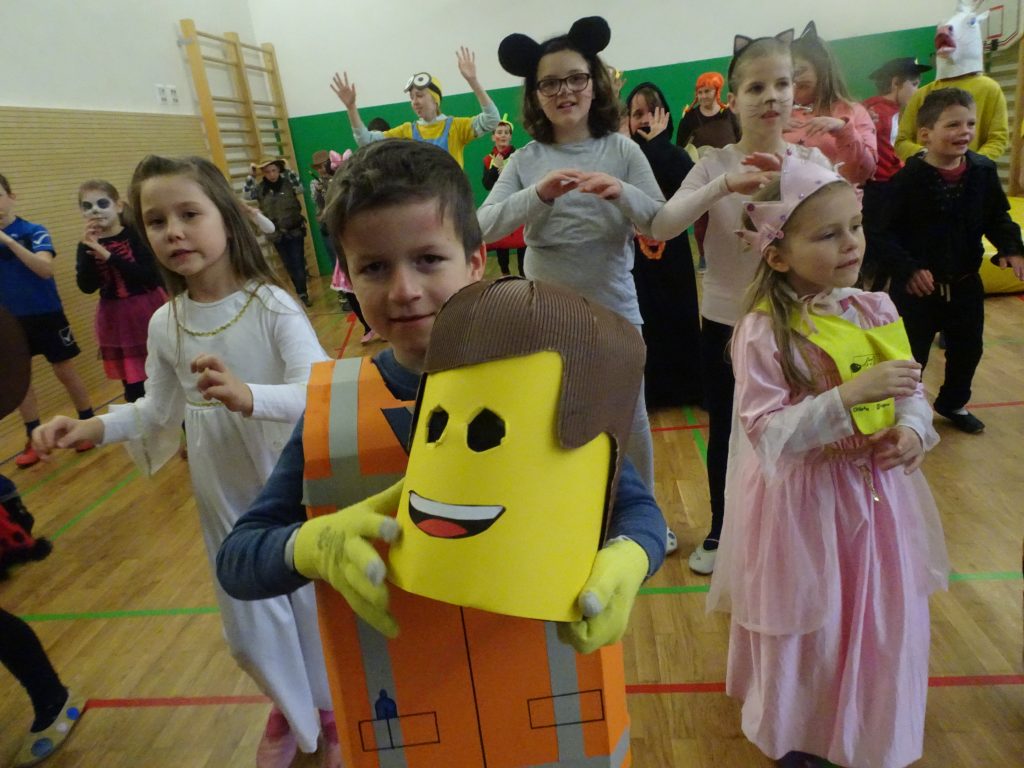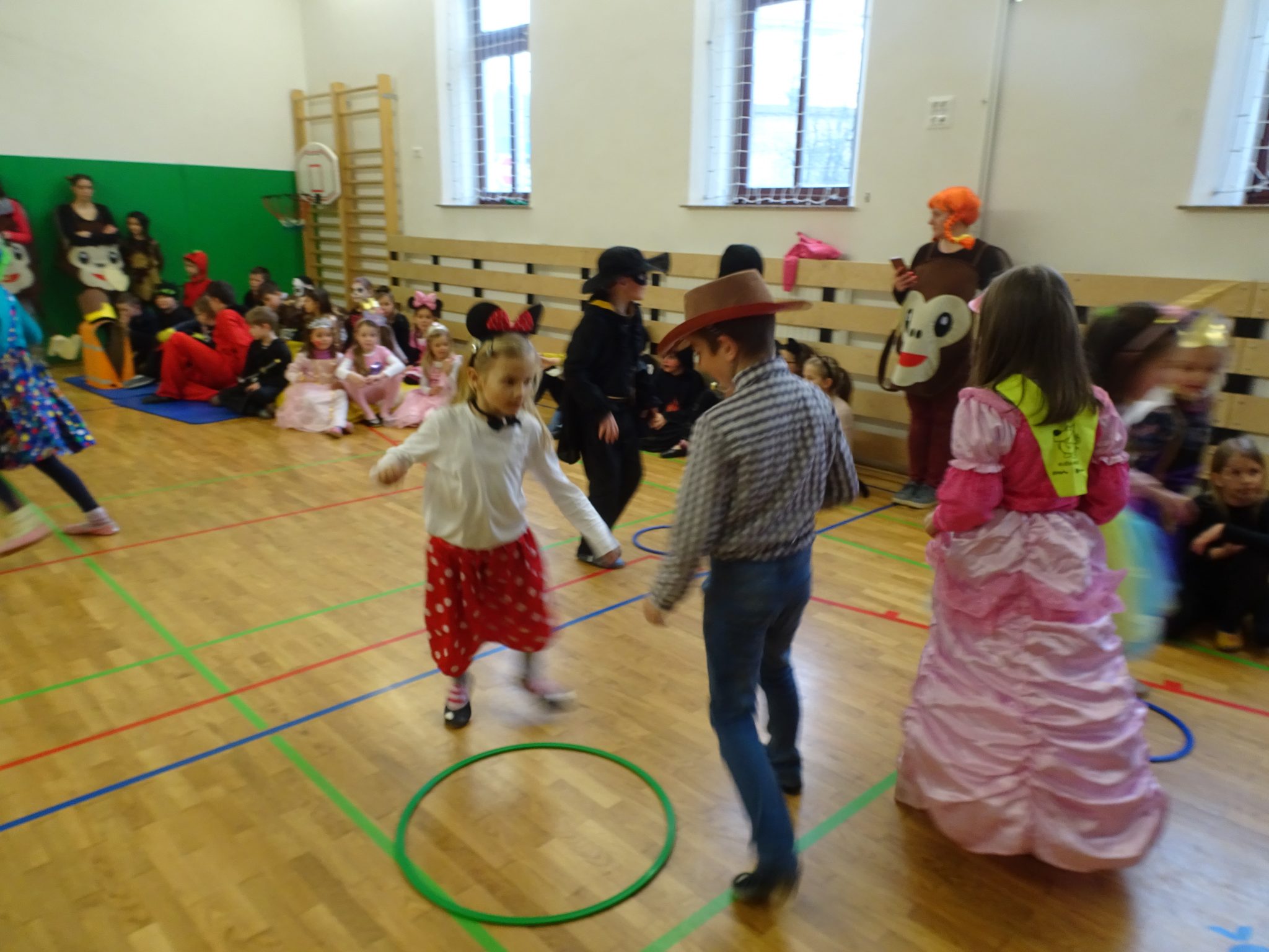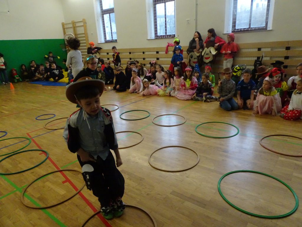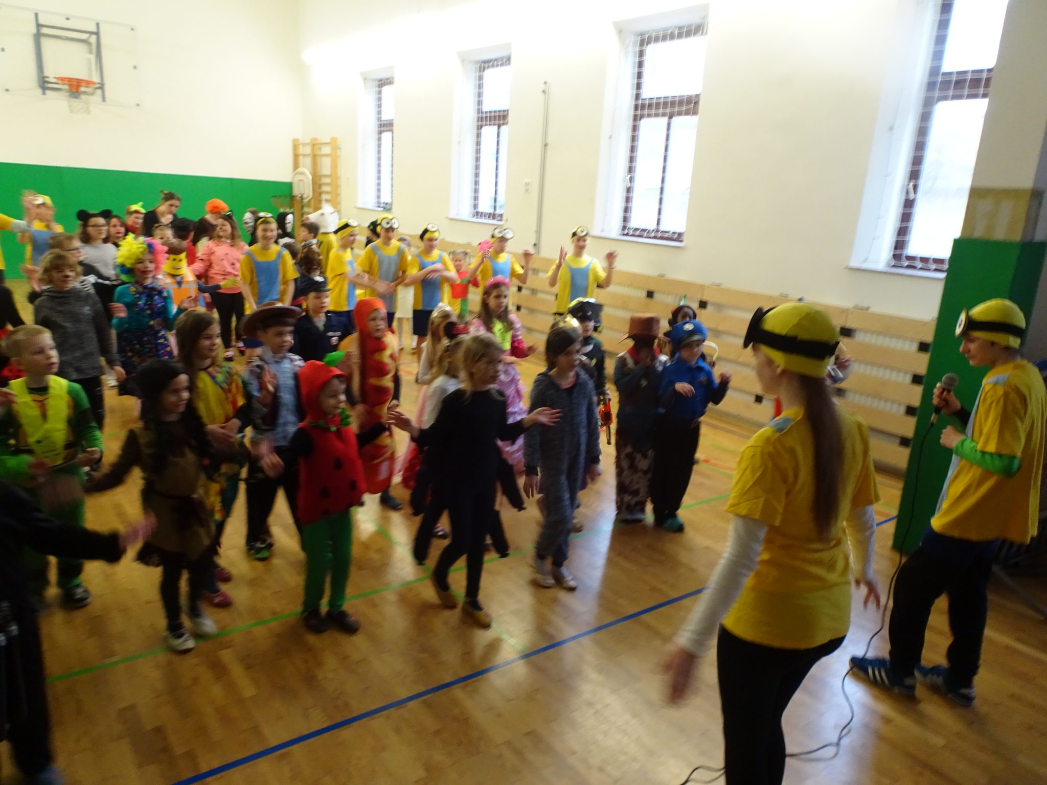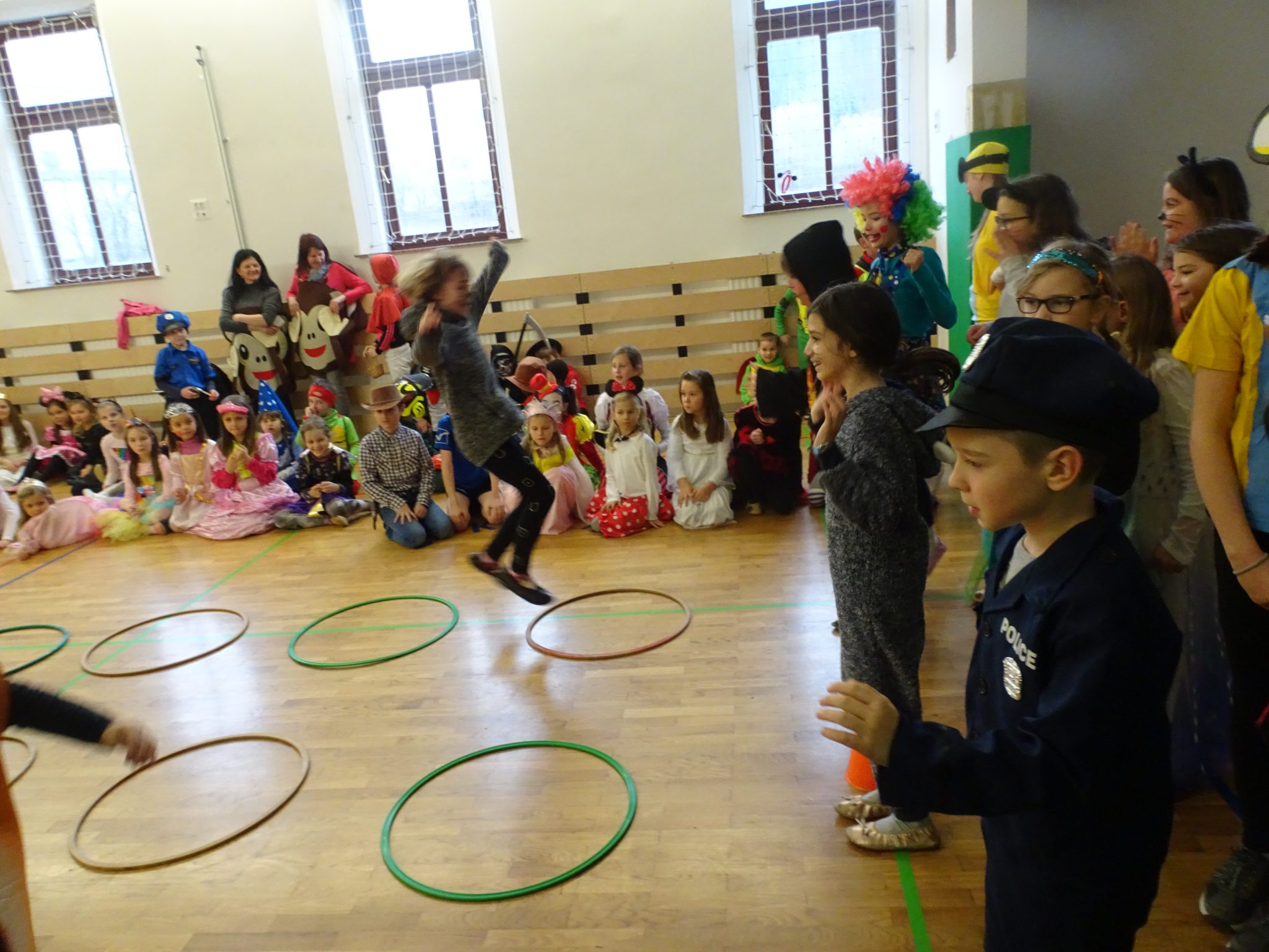 Tako kot vsako leto smo kljub deževnim kapljam odšli na pustno rajanje v telovadnico. Tam nas je pričakalo nekaj učencev predmetne stopnje, ki so pod vodstvom učiteljice Tamare pripravili zabavni program. Pustne šeme so se preizkusile v lovljenju, štafetnih igrah in plesu.