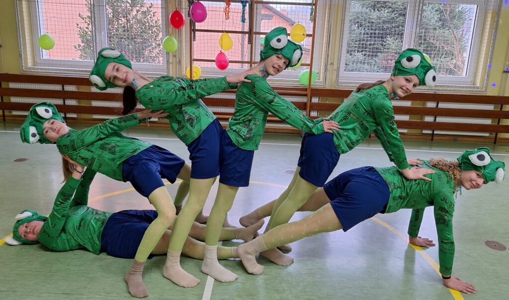 Tokrat je šest poskočnih žabic (Maruša Perne, Ela Uštar, Teja Svetic, Nina Oblak, Karin Zver in Eva Pungertar) pod mentorstvom učiteljice Tamare Bračič pripravilo plesno-akrobatsko točko, ki se je nadaljevala v medgeneracijsko pustno zabavo z najrazličnejšimi maškarami, ki so na pustni torek preplavile podružnično šolo v Nevljah.
