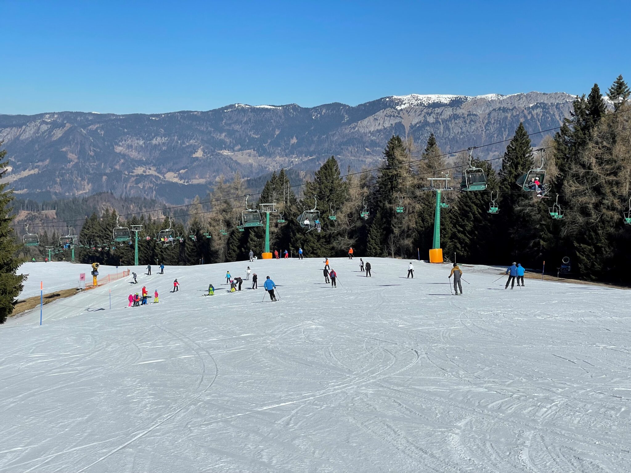 Vozili smo se eno uro in pol. Ko smo prispeli, smo dali nahrbtnike v avtobus, smuči vzeli ven in pomalicali. Vse potrebno za smučanje smo lahko prinesli ali si tam izposodili. Dali so na markirne drese šolar na smuči in karto za smučišče. Prislonili smo jih na avtomat in sedežnica nas je popeljala na vrh. Razgled iz sedežnice je bil zelo lep. Ko smo prišli na vrh, smo si lahko sposodili smučke, pancarje in čelado. Potem smo začeli smučati. Začetniki so se učili stati na smučeh in se premikati na njih. Druga skupina se je učila zavijati in peljati plug. Tretja skupina se je vozila po strminah. Četrta skupina pa po večjih strminah in se učila zapičiti palice v ovinek. Napočil je čas kosila. Šli smo v gostilno na smučišču. Dobili smo rezance, meso in omako. Ko smo pojedli, smo nadaljevali z učenjem malo težjih stvari. Hitro je napočil čas odhoda in odšli smo na sedežnico, da nas je odpeljala na vznožje smučišča. Še prej smo vrnili smuči in ostalo opremo. Nato smo šli do avtobusa in se odpeljali. Domov smo se vrnili ob 17.00. Tam so nas že čakali starši.