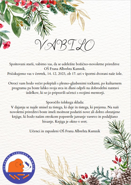 Novice VABILO NA BOŽIČNO – NOVOLETNO PRIREDITEV Sara Zalesnik 1. decembra, 2023 Deli povezavo: Continue Reading Previous MEDNARODNI NATEČAJ VODANext INKLUZIVNI ŠPORTNI DAN Več iz kategorije Novice Zbiramo prostovoljne prispevke za sadike paradižnikov in paprik Brane Božič 20. aprila, 2026 Novice OBČINSKO TEKMOVANJE V MALI ODBOJKI Sara Zalesnik 20. aprila, 2026 Novice EKSKURZIJA V RIM – zadnji dan Sara Zalesnik 16. aprila, 2026