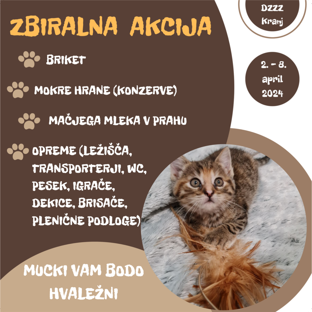 Na OŠ Frana Albrehta od 2. – 8. 4. 2024 organiziramo zbiralno akcijo hrane in pripomočkov za MUCKE. Vse zbrano v akciji bomo predali Društvu za zaščito živali Kranj, ki se že v naprej najlepše zahvaljuje za sodelovanje in nesebično pomoč njihovim mačjim varovancem. Učenci na vseh lokacijah naše šole bodo hrano in pripomočke lahko odložili v kotičku, ki je na njihovi šoli temu namenjen.